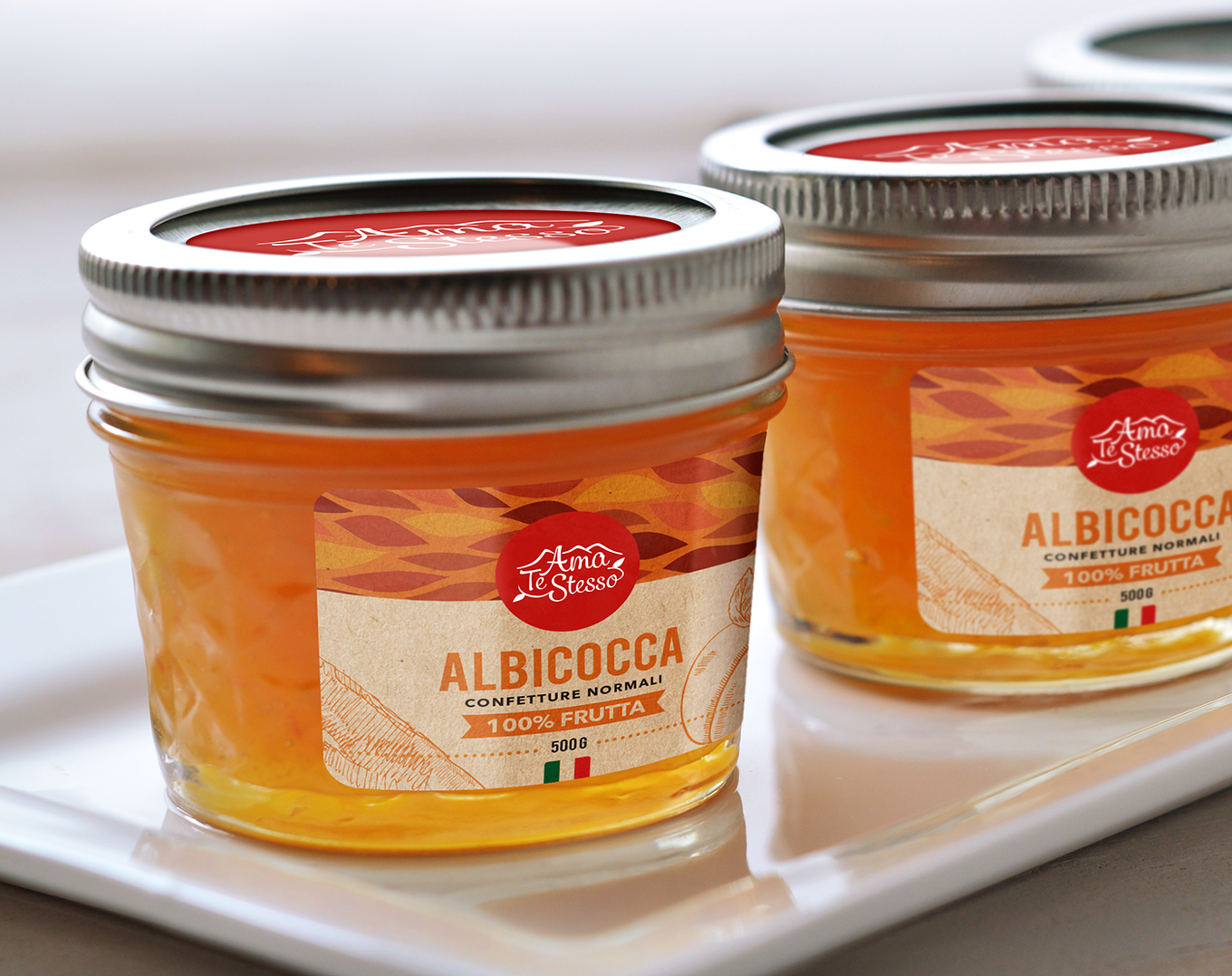Desarrollado en 2014 en Involucra®. Para la marca italiana Ama Te Stesso, dedicada a la elaboración de productos naturales y saludables, se realizaron la propuesta de logotipo, considerando elementos naturales y del lugar de procedencia, así como una propuesta de diseño para el packaging de la línea de mermeladas.
